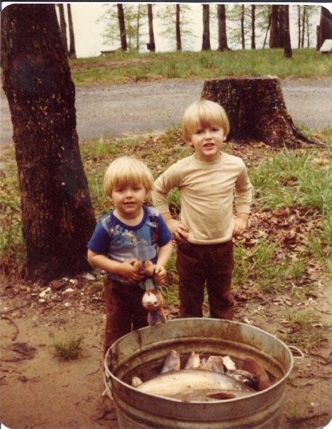 As for me, I thought I’d share with you two pictures. One, you may have seen before. This is of my little brother and me in Kentucky circa 1981. It’s Easter time, because I can remember that we both received that little bunny my (yes, I’ll admit it) cuter sibling is holding. I had one too, but was somehow wise enough at the age of four not to play with it while admiring the day’s haul of catfish.