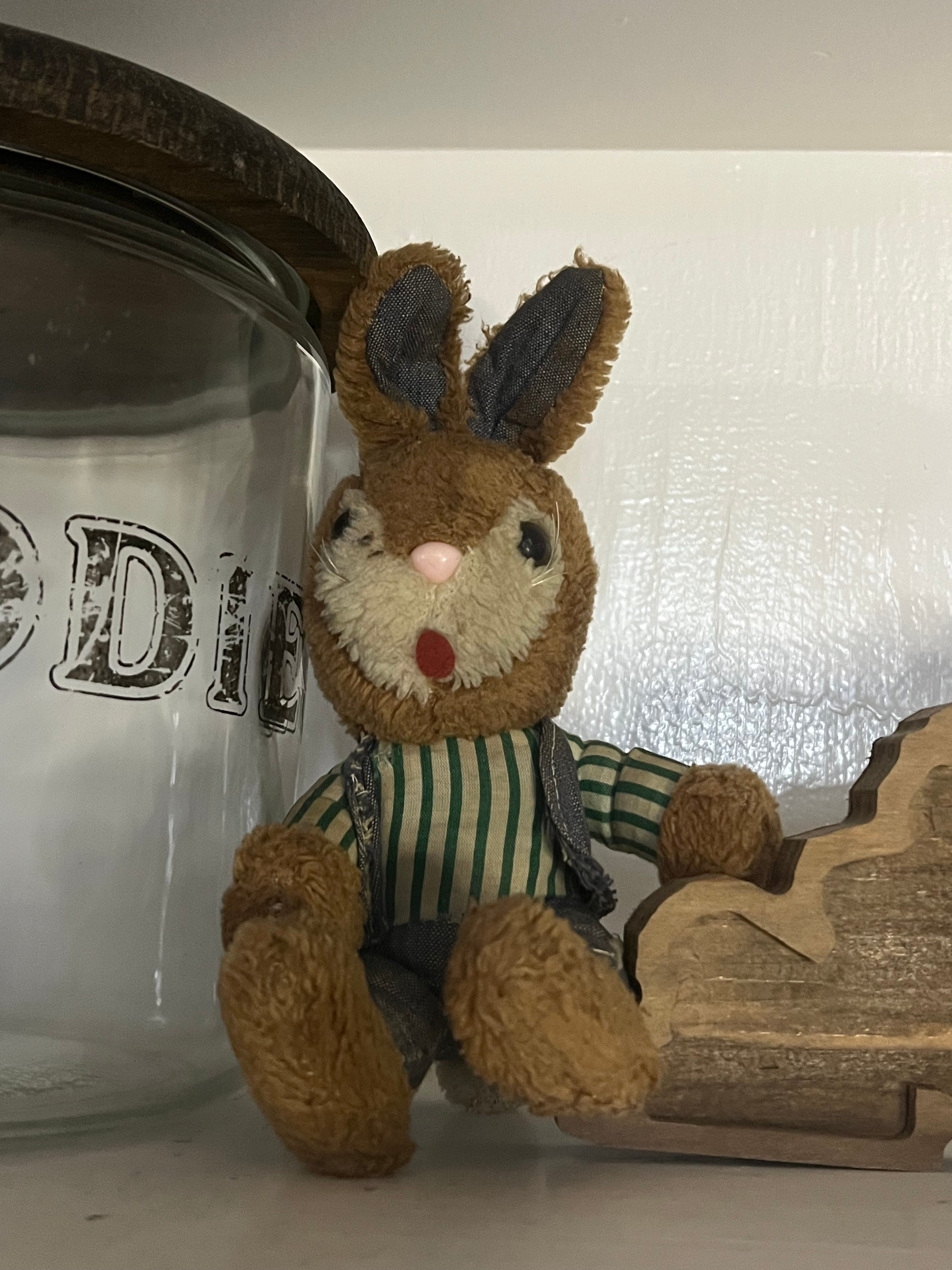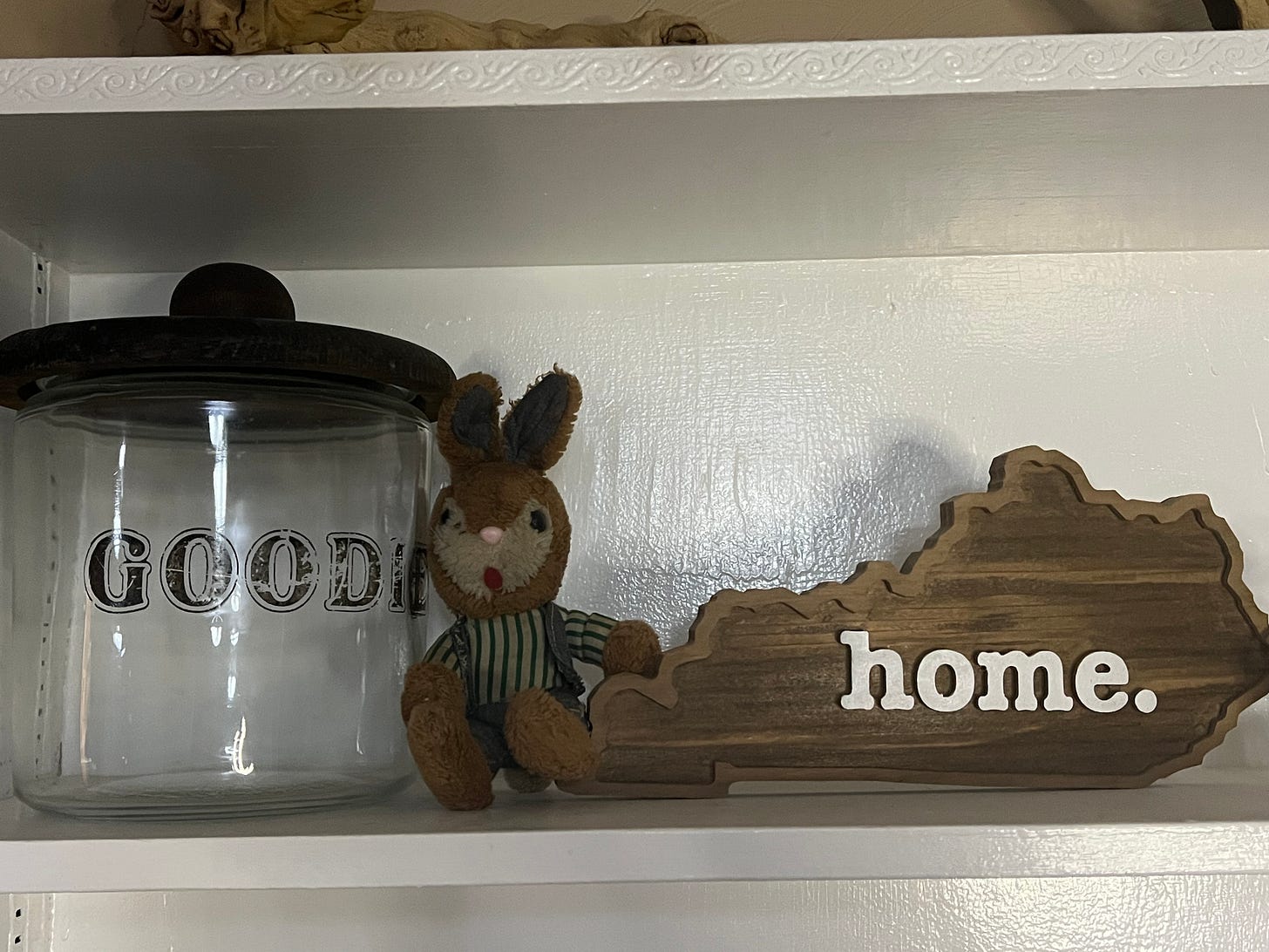 Somehow, my rabbit managed to escape that day and survive with me over these last 44 years. He sits now on the top bookshelf next to my great grandmother’s cookie jar and a cutout of the state of Kentucky that my mom sent me. He’s one of the oldest things I have. I’ve always kept this guy close to me. I’ll probably never live in the Bluegrass again, but he is a reliable reminder of home.