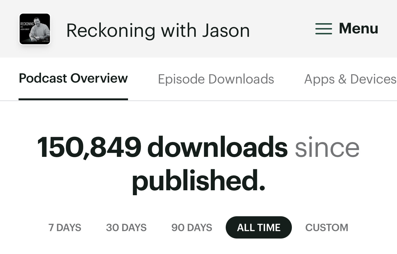 We do have some good news for you regarding the podcast. I’m thrilled to tell you that thanks to your support Reckoning with Jason Herbert crossed over 150,000 downloads this week. That’s pretty awesome.