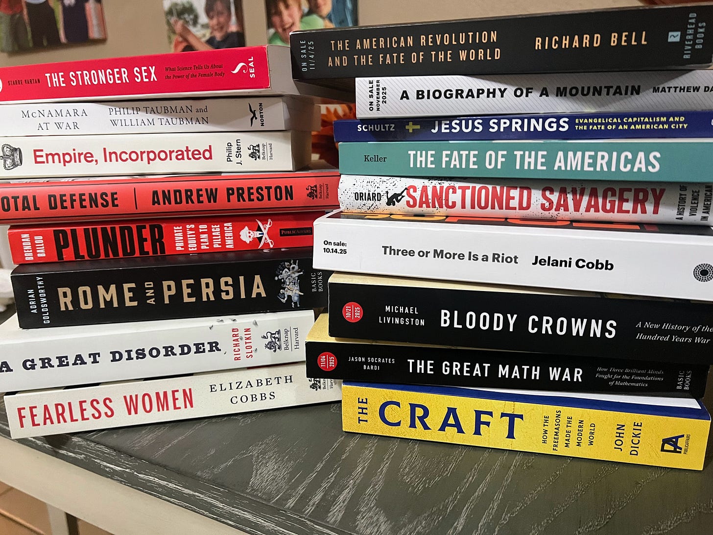 This morning I’m finishing Rick Bell’s The American Revolution and the Fate of the World. He’s recording with me on Monday, which gives me just enough time to go through Jelani Cobb’s Three or More Is a Riot before he records on Friday.